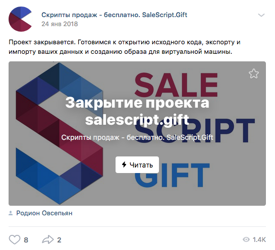 ... закрылся проект Sale Script Gift. Бесплатный конструктор скриптов продаж в течение месяца или двух свернул свои паруса и умер, оставив за собой образ и инструкцию по развёртыванию VM.