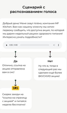 Мы запустили голосовую рассылку с помощью робота-оператора . Он рассказал об акции «комплексное недельное питание в подарок» клиентской базе 2018-2019 годов. Звонки стоили 6 копеек за секунду, и можно было отследить, кто из клиентов сделал покупку после звонка.