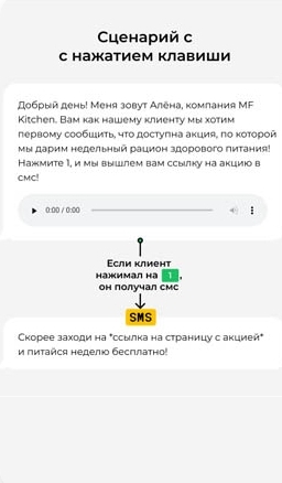 Создать робота для бизнесаНашему роботу можно отвечать словами, а можно — с помощью нажатия клавиш в тональном режиме. Чтобы выбрать способ ответа, мы провели тест: 1450 клиентам звонил и предлагал нажать цифру, а у других 1450 клиентов спрашивал, интересно ли им предложение, и распознавал ответ. Конверсия оказалась выше с нажатием клавиши: 21,5% против 7%. Оставшимся 8731 клиенту звонил по сценарию с нажатием.
